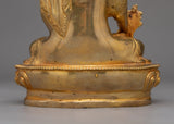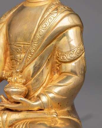 Presenting the Medicine Buddha A small hand-carved statue that was carefully made in Patan, Nepal. This item, which is an excellent example of Nepalese workmanship, is gilded with 24K gold and crafted from quality copper. The portrayal of Medicine Buddha, who represents compassion and healing, is presented in a calm, contemplative pose. Its spiritual significance and beauty are further enhanced by the fine details and vivid acrylic and gold paintings.