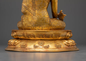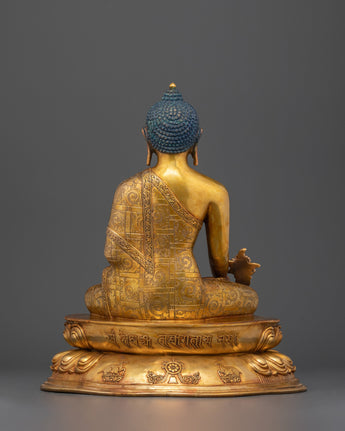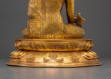 The Medicine Buddha Handmade Antique Touch Statue is a 31.5 cm tall piece of fine copper artfully decorated with an antique finish and 24K gold gilding. This statue is a wonderful addition to any area looking to welcome healing and positive energy since it perfectly portrays the calm and loving presence of the Medicine Buddha. The deity's compassionate attributes are emphasized by the fine carvings and delicate gold accents, signifying his function as a healer.