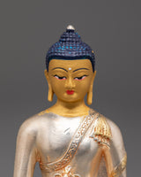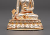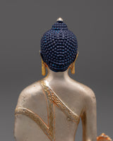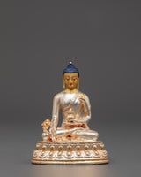The statue, carefully machined with precision, accentuates the Buddha's tranquil look as he sits in meditation pose, holding the healing myrobalan plant in his hand. The combination of copper, gold, and silver plating increases its mystical beauty, making it ideal for meditation altars, shrines, or as a meaningful spiritual gift. Each detail symbolizes Tibetan artistry and the profound symbolism of healing. Placing this Medicine Buddha Healing Buddha Sculpture in your meditation space or home is believed to attract positive energy, aid in recovery, and strengthen mindfulness practices. It is cherished by practitioners seeking guidance, peace, and spiritual protection.