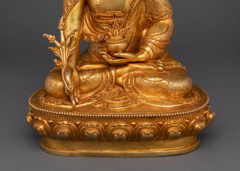 The Medicine Buddha of Healing statue is an important emblem of Tibetan Buddhism, representing healing, wisdom, and compassion. This finely constructed sculpture stands 13" (33 cm) tall and has a 9.3" (23.5 cm) base. It is made of pure copper and features painstaking 24K gold gilding and detailed gold and acrylic paintwork. This sacred figure represents the essence of healing and purification in Buddhist iconography, making it an ideal addition to any meditation room or shrine.