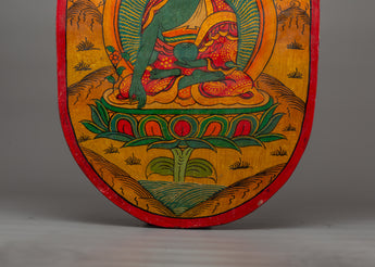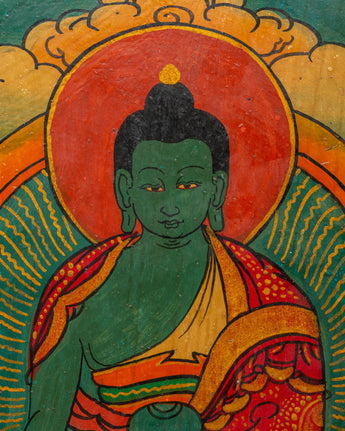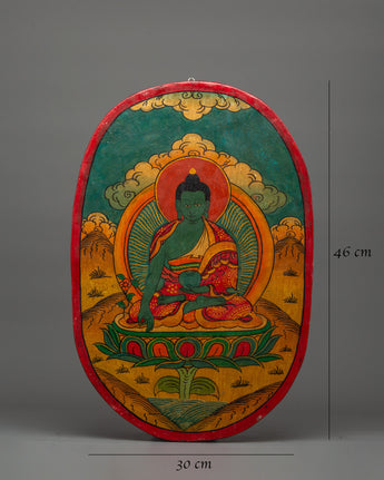 This Medicine Buddha Wall Hanging is a powerful piece of Tibetan art, hand-painted on wood in vibrant acrylic colors. It measures 46 cm in height and 30 cm in width, intended to bring healing and protection to your space. The Medicine Buddha is renowned for healing physical and spiritual ailments, making this wall hanging an excellent addition to any home, healing space, or meditation room. The beautiful artwork and vivid colors capture the Medicine Buddha's serene and compassionate nature.