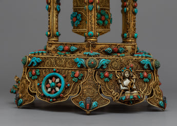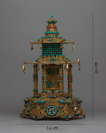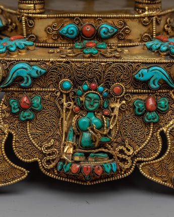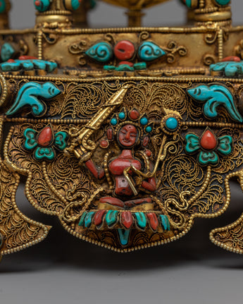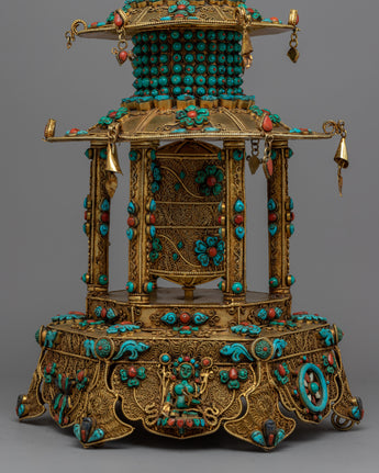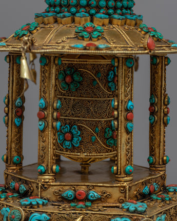 Let me introduce you to the magnificent Meditative Turquoise & Coral Prayer Wheel - a work of sheer elegance and spirituality that you will not want to miss! This exquisite creation features a copper body that is adorned with resplendent 24k gold plating and embellished with turquoise and coral stones that add not only beauty but also profound symbolism.