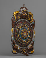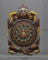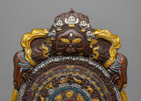 The Metal Wall Hanging Buddhist Calendar is a stunning work of art, precisely built from oxidized copper and delicately plated in electro gold and silver. This gorgeous calendar is 42 cm tall and 27.5 cm wide, weighing a total of 0.87 kg, making it a lightweight yet impactful addition to your decor. The brilliant artificial stones of coral and turquoise bring color and spirituality to this item, taking it to an impressive degree of craftsmanship.