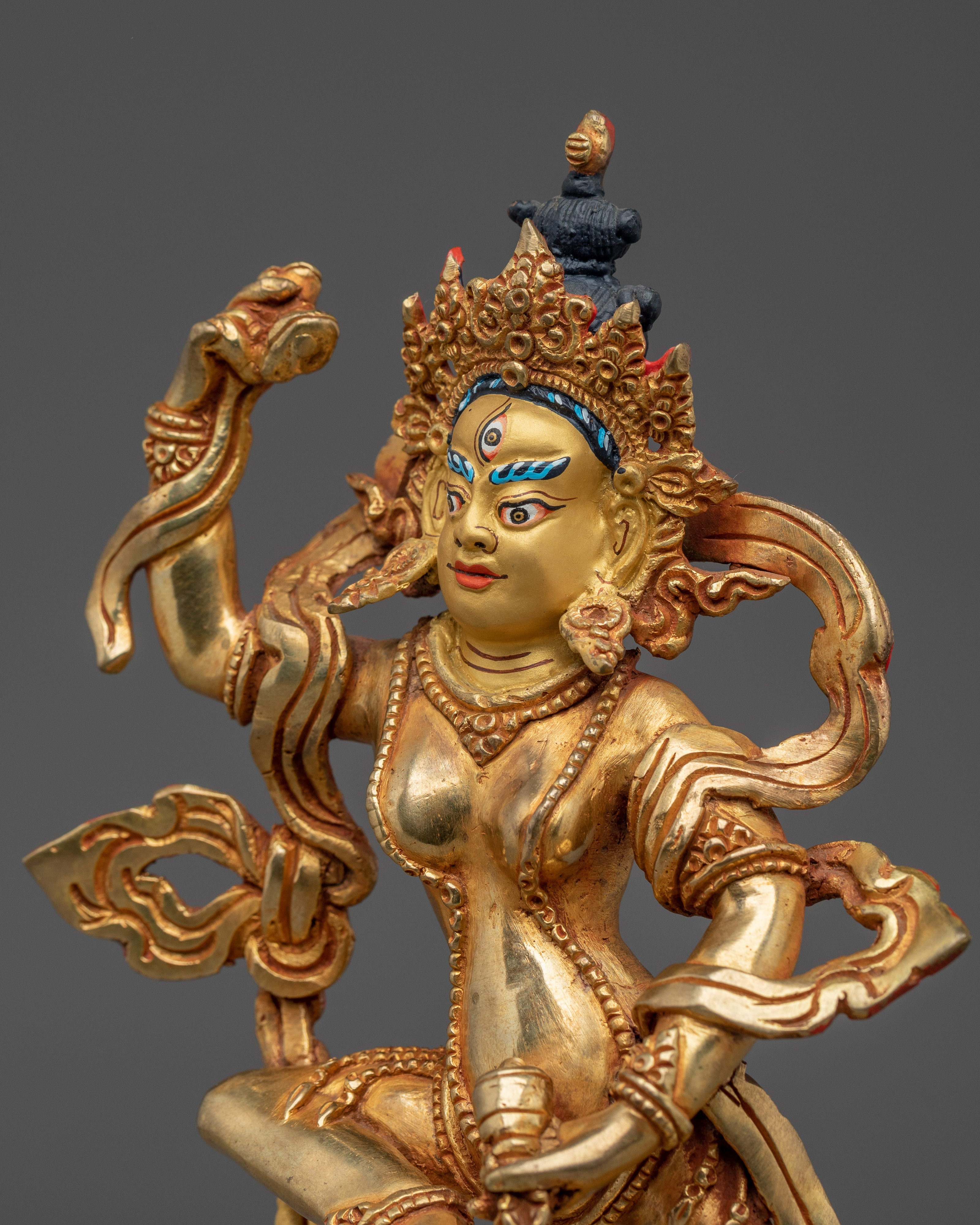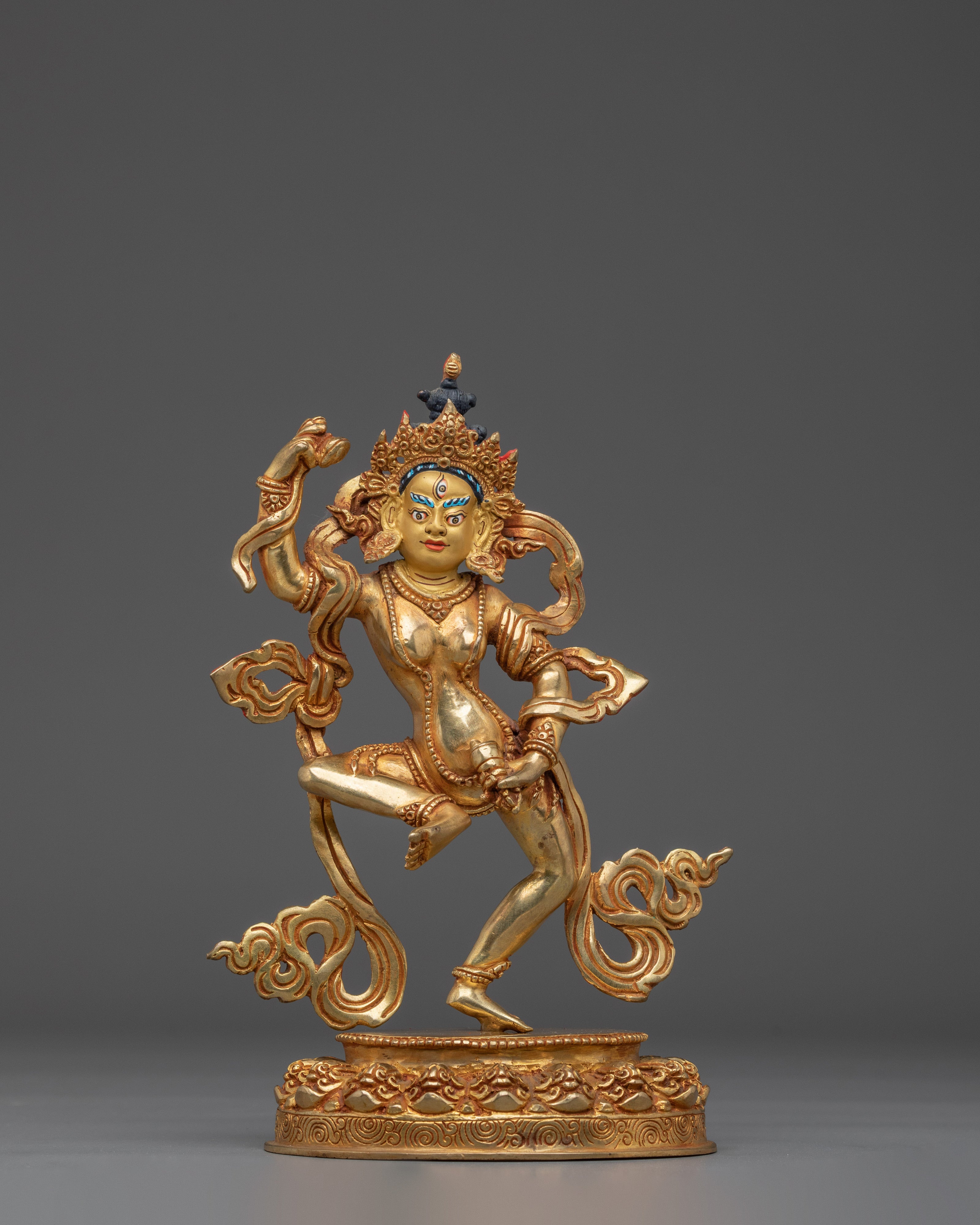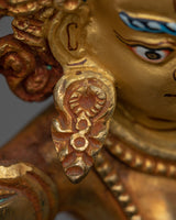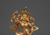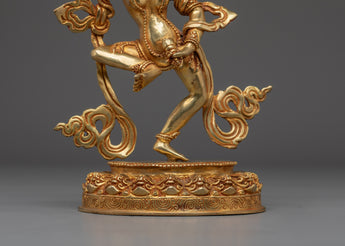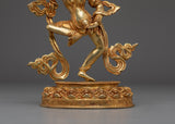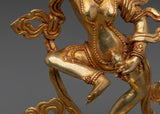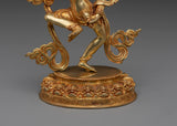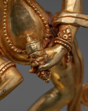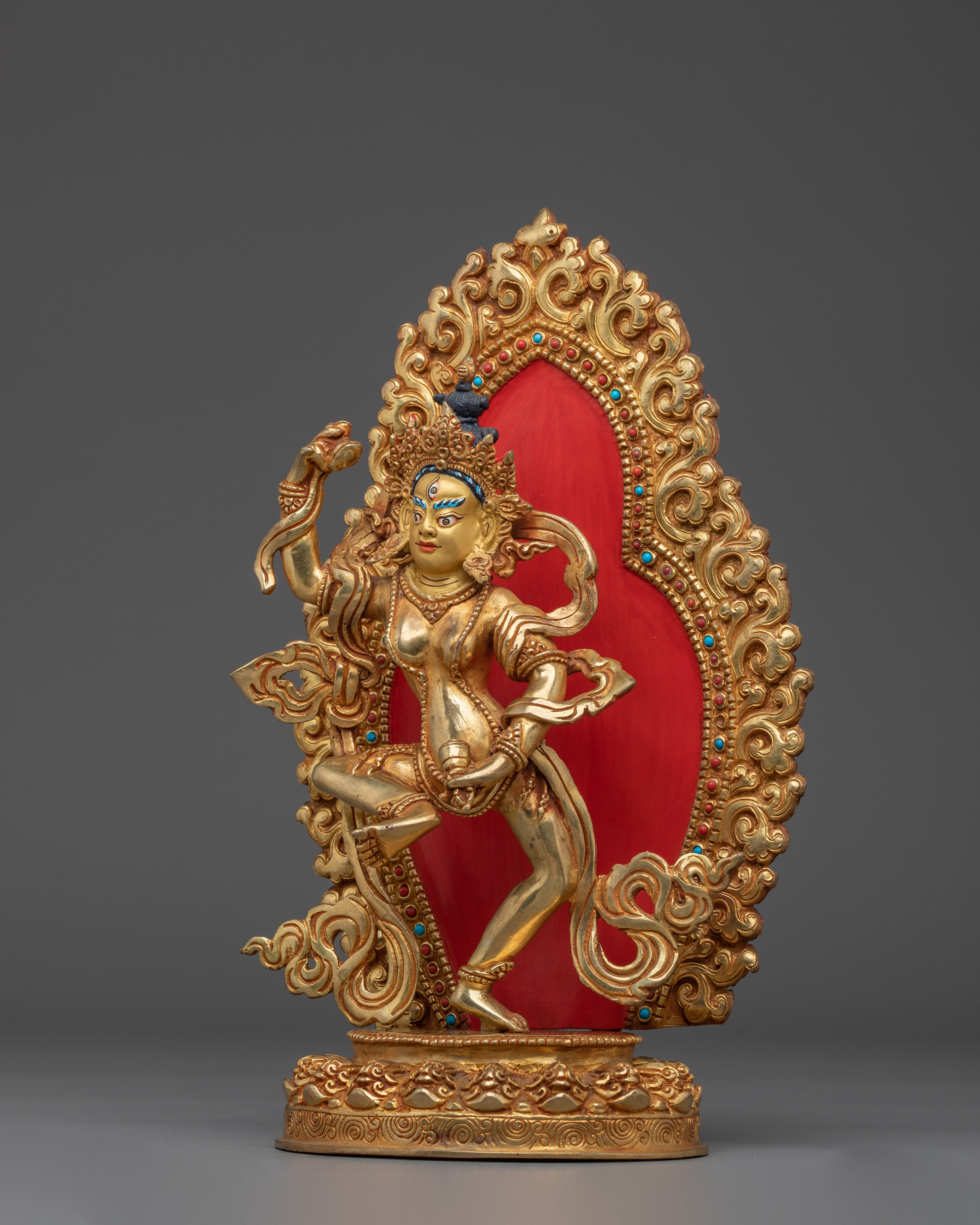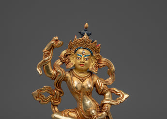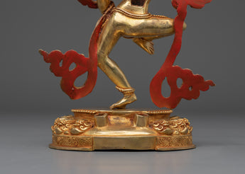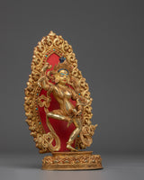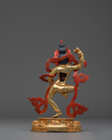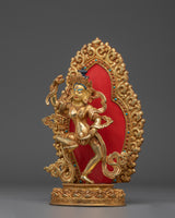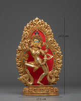 This Tibetan Mighty Yogini Machig Labdron Statue pays tribute to the legendary Tibetan yogini celebrated for her transformative Chöd teachings and fearless spirit. Captured in a powerful dancing stance, she holds sacred ritual instruments symbolizing transformation, mental clarity, and liberation from illusions—core elements of spiritual growth. The statue is framed by a beautifully detailed flame-like aureole that radiates strength, wisdom, and divine energy, making it a striking centerpiece. Crafted from a copper body with gold gilding and adorned with artificial coral and turquoise stones, this statue serves as a profound focal point for meditation altars, personal shrines, or as an inspiring gift for spiritual seekers aiming to deepen their practice and courage.