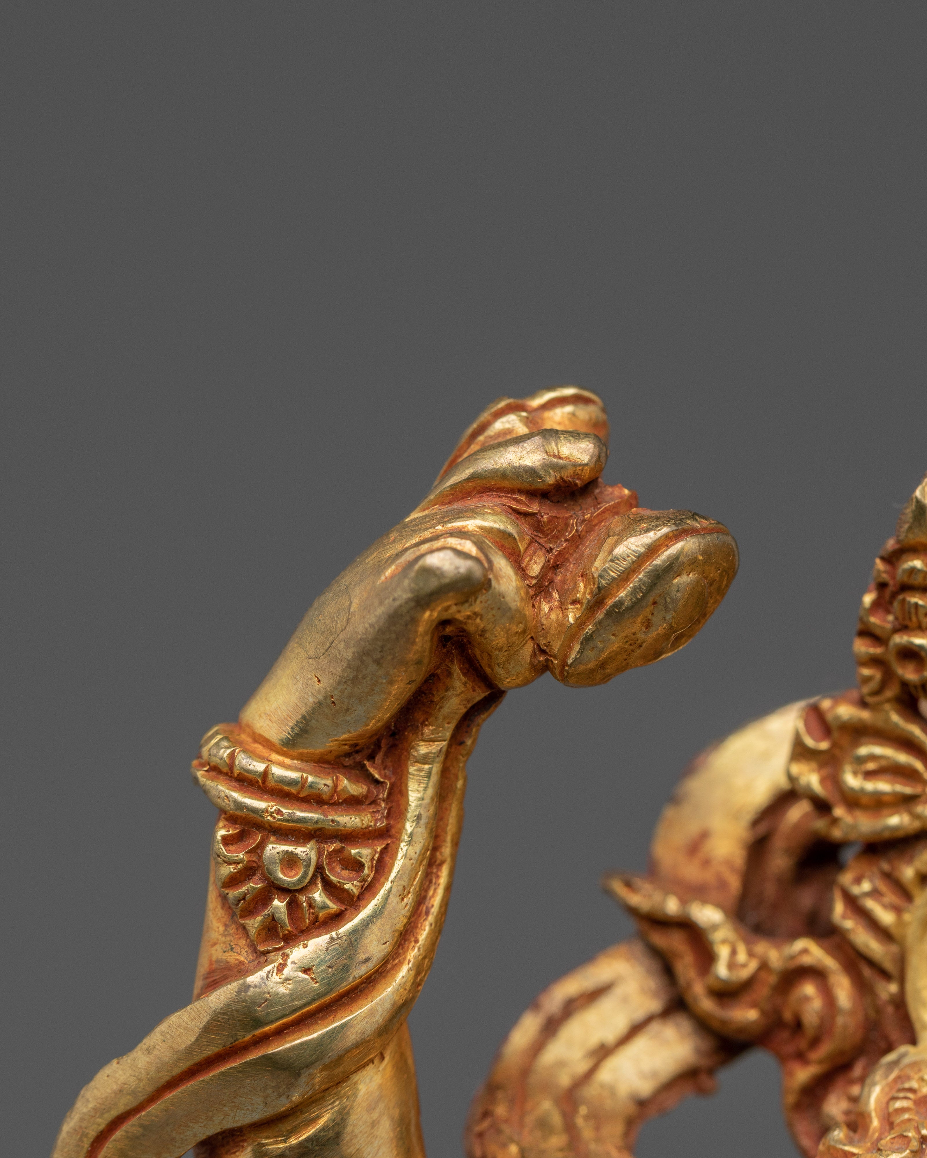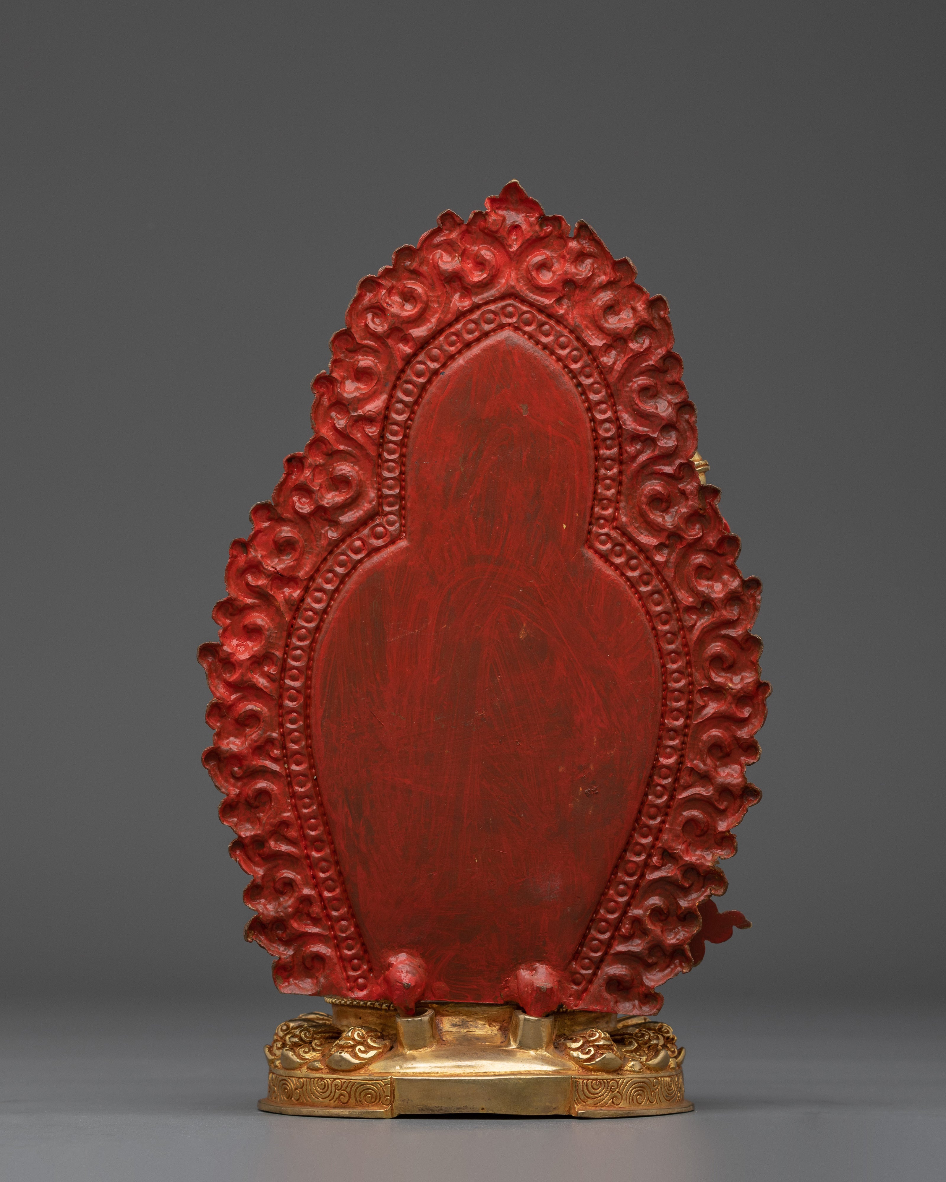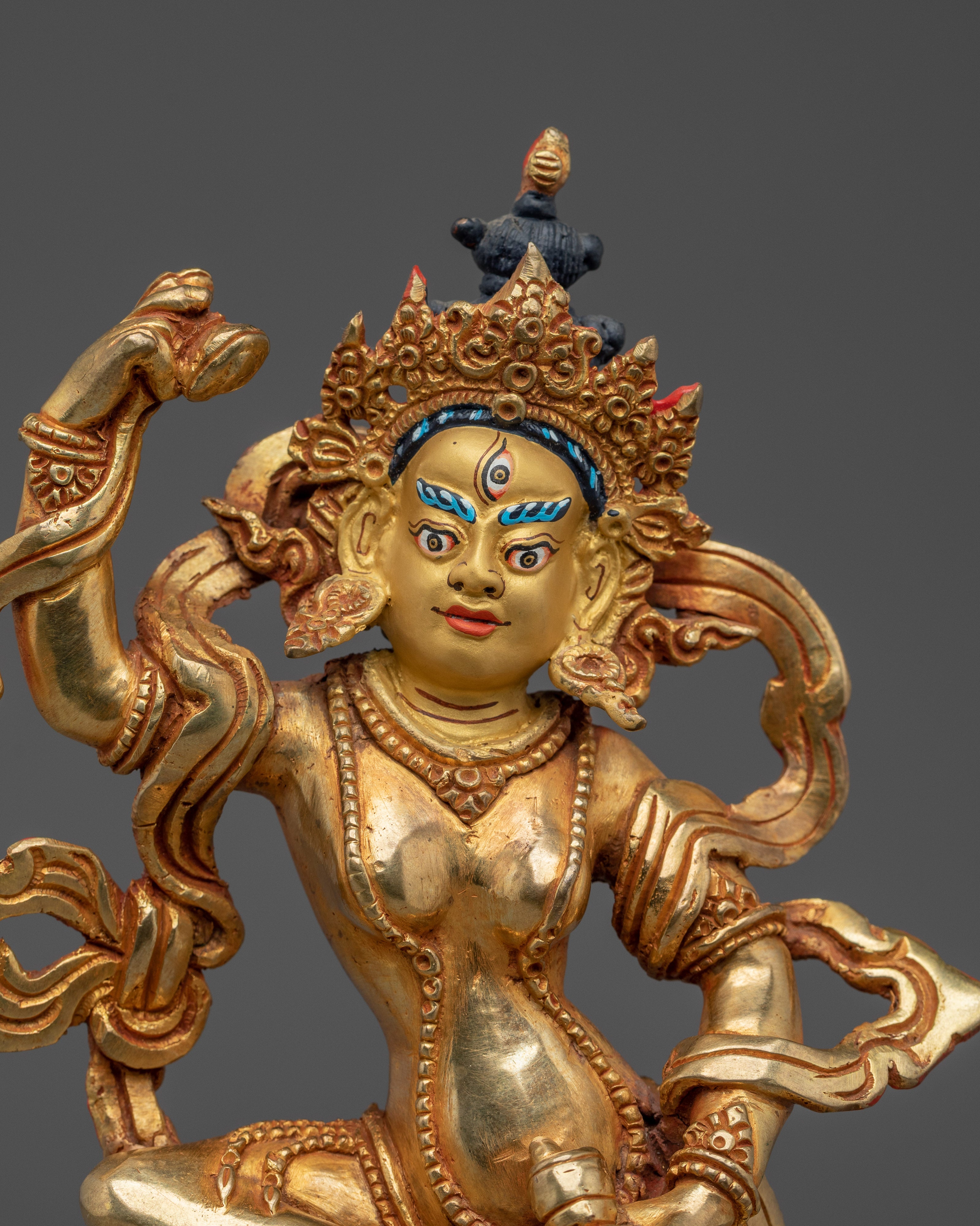 This Tibetan Mighty Yogini Machig Labdron Statue pays tribute to the legendary Tibetan yogini celebrated for her transformative Chöd teachings and fearless spirit. Captured in a powerful dancing stance, she holds sacred ritual instruments symbolizing transformation, mental clarity, and liberation from illusions—core elements of spiritual growth. The statue is framed by a beautifully detailed flame-like aureole that radiates strength, wisdom, and divine energy, making it a striking centerpiece. Crafted from a copper body with gold gilding and adorned with artificial coral and turquoise stones, this statue serves as a profound focal point for meditation altars, personal shrines, or as an inspiring gift for spiritual seekers aiming to deepen their practice and courage.