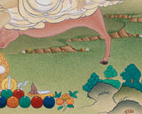 Explore the deep spiritual world of Tibetan meditation with this stunning Milarepa with Vajradhara Thangka. Created in our Enlightenment Studio, this beautifully hand-painted piece is made on premium cotton canvas using natural Lhasa stone pigments and 24K gold. The thangka shines with both spiritual significance and visual beauty. The stone pigments provide vibrant colors and lasting richness, while the gold accents make the sacred figures stand out, emphasizing their divine essence. Following the traditional Karma Gadri style, which is known for its peaceful design, intricate workmanship, and harmonious balance, this thangka serves as both a beautiful work of art and a treasured object of devotion.