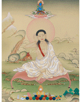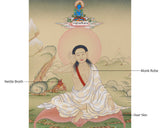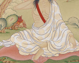 This thangka depicts Milarepa in a meditative pose, with one palm cupped to his ear, symbolizing his mastery of poetry and music. At the top center is Vajradhara, the primordial Buddha, representing the source of enlightened blessings and highlighting the transmission of wisdom and spiritual lineage. The painting illustrates the sacred bond between teacher and disciple and the balance between earthly practice and divine guidance. Every detail, from Milarepa's simple robes to Vajradhara's radiant aura, is meticulously hand-painted, creating a visual narrative that encourages devotion and reflection. Placing this Milarepa with Vajradhara thangka in your sacred space will allow its divine energy to inspire your meditation, uplift your spirit, and connect you with the timeless wisdom of Tibetan masters.