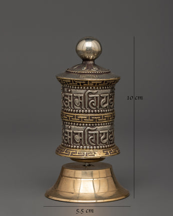 This Mini Tibetan Prayer Wheel, expertly handcrafted from brass, copper, white metal, and wood, will bring spiritual energy to your daily practice. With the enduring "Om Mani Padme Hum" mantra written in Tibetan script, this small yet effective prayer wheel, which stands only 10 cm tall and 5.5 cm wide, invites compassion, serenity, and protection with every turn.