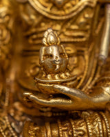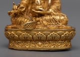 The Miniature Guru Rinpoche Statue stands only 7 cm tall, but it emits tremendous spiritual importance. This statue is composed of oxidized copper and embellished with a rich 24k gold plating. It was precisely crafted utilizing machine molding techniques. Despite its diminutive size, it encapsulates the essence and charm of Guru Rinpoche, an adored person in Tibetan Buddhism.