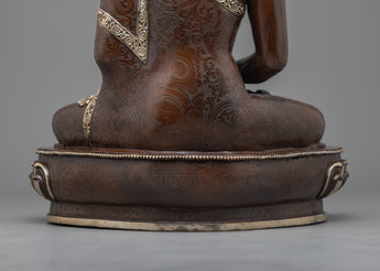The statue of Amitabha Buddha, crafted with unmatched skills, is a symbol of compassion and enlightenment. The statue's stunning presence is enhanced by the elegant touch of silver-plated details. The carefully carved lotus pedestal, made of oxidized copper, represents spiritual regeneration and purity. The pedestal, which is enhanced with delicate silver plating, enhances the statue's beauty and symbolic meaning, encouraging devotion and spiritual development.
