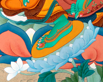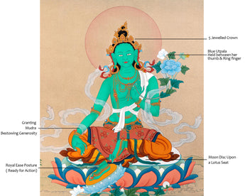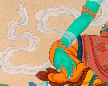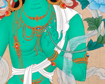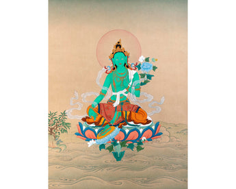 Mother Green Tara, seated in a lalita pose, has been painted elegantly in this thangka by the artist. In Bodhisattva deity's left hand, she holds an utpala, a sign of purity, while her right-hand grants mudra. Her Bodhisattva activity is rapid; like the wind element, her color is green. Because she is eager to respond to individuals who need her assistance, her right hand is in varada mudra. Her jewelry and ornaments are a perfect match for her elegant gaze. She wears multicolored and heavily patterned silks on her lower torso. A long white scarf flows through her body like a wind. The background of where she is portrayed is a river with waves and a dark sky.