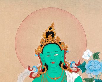 Note: Green Tara Thangka is an original painting from Enlightenment Studio, located at Boudha Stupa.