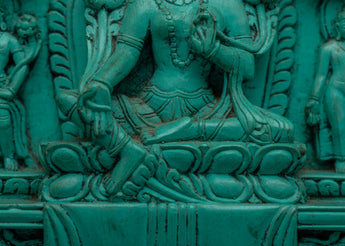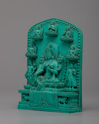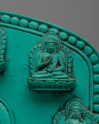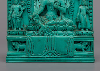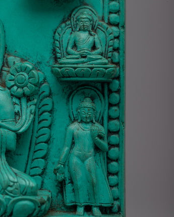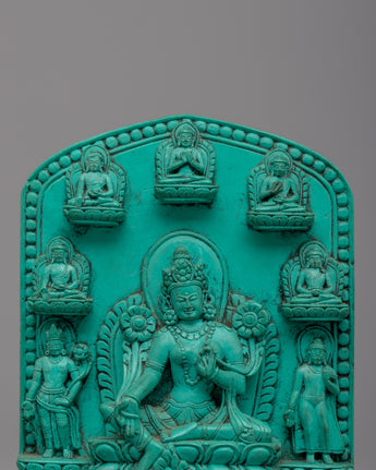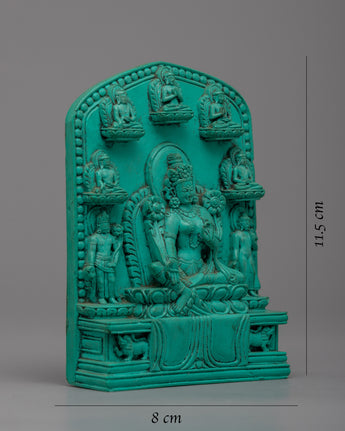 Introducing our exquisite Mother Green Tara Buddha Statuette, meticulously handcrafted using genuine turquoise powder. This magnificent statuette features intricate carvings of various deities on the sides, enhancing the divine presence of Mother Green Tara. The vibrant turquoise hue adds a touch of elegance and spirituality to this sacred piece, symbolizing purity and protection. Embrace the blessings of Green Tara, known for her compassionate and nurturing nature, and let her presence inspire you to cultivate inner strength and wisdom. Display this statuette in your sacred space or as a focal point in your home, and feel the uplifting energy and serenity it brings to your surroundings.