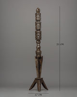 The Multi-Faced Iron Kila is more than a ceremonial dagger; it's a work of spiritual art intended to harness transformational energy and defend against negativity. Standing 51 cm tall, 17 cm wide, and weighing a substantial 4.49 kg, this remarkable item grabs attention with its imposing presence. It is hand-carved from iron and bears meticulously sculpted wrathful faces along its handle, each oozing a fiery intensity representing overcoming hurdles and triumphing over ignorance.
