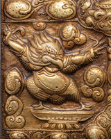 This Mythical Garuda Wall Hanging is an exquisite depiction of the Garuda, a legendary bird and protector god in Buddhist and Hindu religions. This wall plaque is handcrafted from brass with an iron frame and weighs 2.18 kg. It is 29 cm in height and 41.5 cm in width. The Garuda is shown in a forceful position, representing strength, protection, and courage. The elaborate engravings feature excellent detailing of legendary patterns, cloud motifs, and protective symbols, resulting in a visually appealing work that captures the essence of Himalayan artistry. This brass wall hanging is ideal for meditation rooms, living spaces, or sacred places, as it radiates a powerful and regal aura that provides spiritual protection.