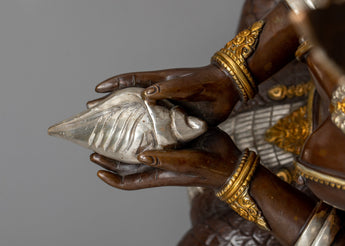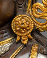 This statue, expertly fashioned from oxidized copper, undergoes a unique process that gives it a rich, polish that makes it resemble priceless antiquities. The sculpture comes to life through a striking combination of colors and textures created by the opulent embellishments of silver plating and 24K gold gilding, which contrast brilliantly with the rusted surface.