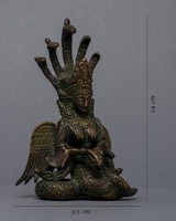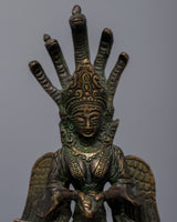 The Vintage Naga Kanya Statue, carefully handcrafted on copper, beckons from the past and exudes an air of antiquity. This statue, a captivating artifact from the past, exudes a reverent respect for history through its vintage essence. In this masterful creation, the mythical serpent deity known as the Naga Kanya comes to life, embodying both strength and grace. This statue, which weighs 0.662 kg, carries the weight of the cultural narratives and beliefs that have shaped it in addition to its physical presence. This Vintage Naga Kanya Statue connects a thread between the past and the present as a tribute to ancient craftsmanship and spiritual symbolism, inviting us to explore the mysteries and beauty of tradition.