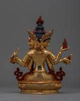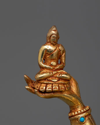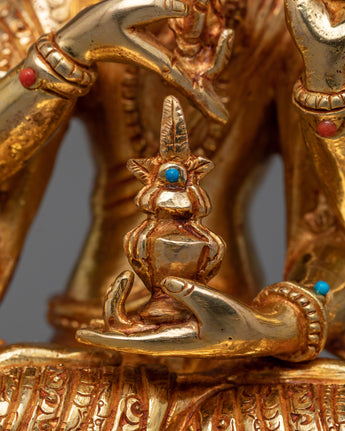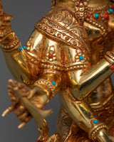 Our beautiful Namgyalma Dakini Statue, skillfully carved by talented artisans, will add a calming and protective atmosphere to your surroundings. This statue was skillfully sculpted from a copper body and stands 9.1 inches tall with a 7.5-inch base. It is gilded in 24K gold and has intricate paintings in both gold and acrylic that fit well with it. In Buddhist tradition, Namgyalma, in her Dakini aspect, is a highly venerated character, honored for her capacity to prolong life, strengthen spiritual energy, and guard against disasters.