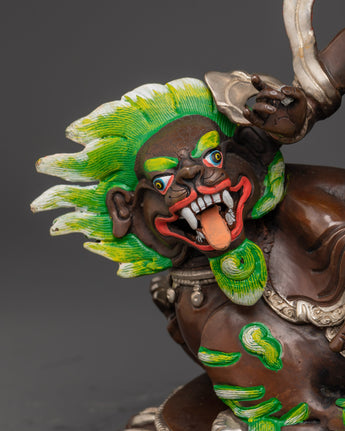 A dramatic flame aura backdrop, a prominent motif in statue representing transformation and the elimination of obstacles, adds to the figurine's appeal. The intricate details in Namtoshe's robes and the lion's mane demonstrate superb craftsmanship, bringing this figure to life with a distinct feeling of Vigor and purpose. Elaborate jewelry and complex designs on his armor offer layers of meaning, with each feature delicately painted to emphasize spiritual qualities. This Namtoshe statue is not only a stunning work of spiritual art but also a beacon of prosperity and protecting energy, making it excellent for people seeking spiritual and material abundance.