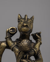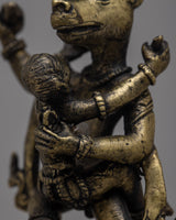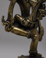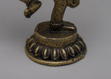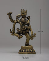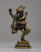 The Narasimha Bronze Statue is a remarkable representation of Lord Narasimha, the ferocious manifestation of Lord Vishnu. Handcrafted from bronze with painstaking attention to detail, this statue depicts Lord Narasimha's intensity and force as he rises from a pillar to destroy the demon Hiranyakashipu. Standing at 14cm tall, the statue depicts Lord Narasimha standing on one leg with his consort , symbolizing his ultimate victory over evil.
