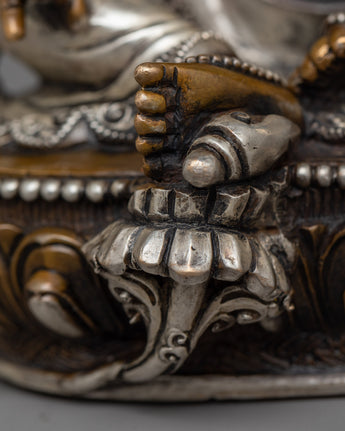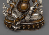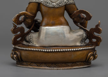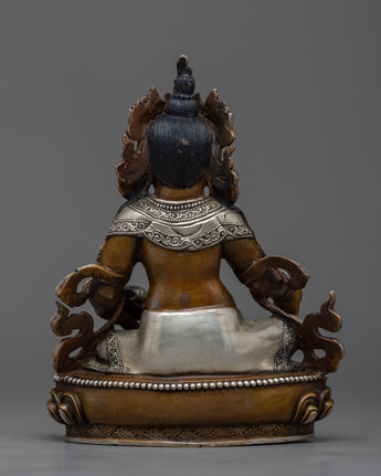 This sculpture is one of a kind since it contrasts an oxidized copper body with a silver-plated finish, showcasing the intricate details and exquisite craftsmanship of Dzambhala's regal pose and symbolic features. The oxidized background gives the statue a deep, rich texture that accentuates its overall presence, while the silver plating adds a bright sheen that emphasizes Dzambhala's relationship with wealth.