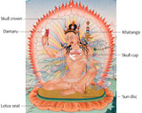 We have finely hand painted the thangka art of Niguma in traditional Karma Gadri Style. In this art, we have used genuine 24k gold to gild and acrylic color to paint in mesmerizing cotton canvas. You can utilize this artwork in your different meditation or yoga activities, for various indoor home decor purposes, and even in other Buddhist rituals. We have portrayed her seated on top of a sun disc lotus seat, holding a damaru in her right hand while a skull cup in her left hand. The elegant skulled crown, adorned with precious gemstones, illuminates her face, and the vibrant nimbus, plated with gold, encircled with fire flame is engulfing her. This meticulous artwork of a Nepali artist whose artisan has passed through generations will be a tremendous gift to a practitioner like you.