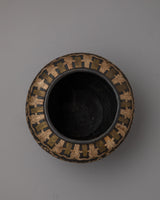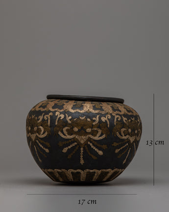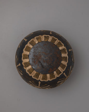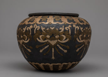 Presenting the Rice Offering Bowl, a magnificently made object that perfectly captures the great creativity and spiritual legacy of Tibetan craftsmanship. Crafted from iron and embellished with a detailed silver inlay, this beautiful offering bowl measures 13 cm in height by 17 cm in breadth and weighs 0.97 kg. The exquisite craftsmanship and intricate design pay homage to the profound cultural significance of offering bowls in Tibetan Buddhist ceremonies, which stand for devotion and charity.