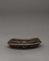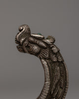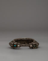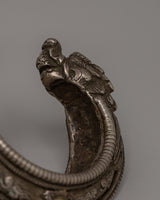 This Old Stone Dragon Head Motif Bracelet is a stunning representation of artisanal craftsmanship that combines traditional symbolism with elegance. This bracelet is made of 18k silver and includes an exquisitely intricate dragon head pattern, which represents strength, protection, and power. This cuff, measuring 2.5 cm tall, 9 cm wide, and 25 cm in circumference, has been designed to make an attractive and enhanced statement. It weighs 0.25 kg and has a significant yet comfortable feel, making it great for collectors or as an eye-catching accent.