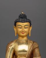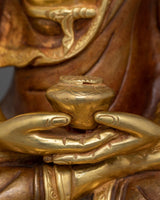 This statue was handcrafted in Nepal from oxidized copper and embellished with acrylic and gold paintings and 24K gold gilding. Amitabha is shown holding a sacred alms bowl while sitting in a meditative position, signifying unending wisdom and compassion. This holy work of art creates a peaceful atmosphere and is a potent reminder of enlightenment and infinite peace.