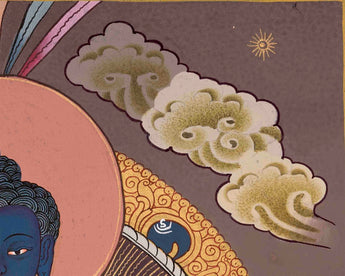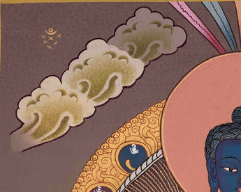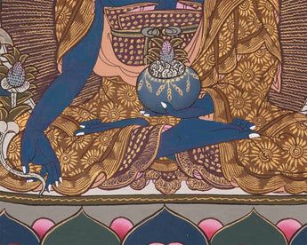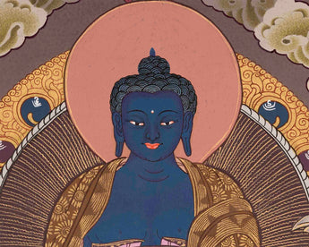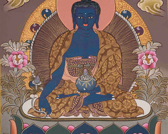 This Original Hand-Painted Blue Medicine Buddha is a depiction of the Medicine Buddha, also known as Bhaisajyaguru in Sanskrit, with a blue-colored body symbolizing healing and wisdom. The Medicine Buddha is an iconic figure in Mahayana Buddhism, particularly in the Tibetan tradition, revered as a compassionate healer with the power to alleviate suffering and guide spiritual awakening. This hand-painted thangka showcases intricate details and vibrant colors, reflecting the artist's skill and devotion. This thangka can be used in rituals and meditation practices to invoke the healing blessings of the Medicine Buddha.