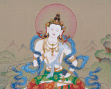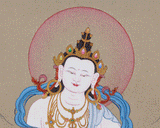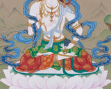 Vajrasattva, an essential figure in Tibetan Buddhism, represents purification and is called upon to remove obstacles and negative karma. Practitioners often chant the mantra "Om Vajrasattva Hum" to cleanse their hearts and minds, helping them overcome emotional and mental barriers. Depicted sitting on a lotus throne in this beautiful thangka, he symbolizes spiritual awakening and purity. The divine features surrounding him highlight his purification role, while his calm expression radiates serenity. He is adorned with a detailed five-jeweled crown, a bell, a flowing scarf, and the vajra symbol, each representing different aspects of his strength and wisdom. Order your Vajrasattva Thangka today to purify your space and invite his transformative energy into your space.