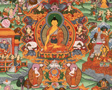 The "Shakyamuni Buddha Life Story Thangka" is a visual narrative that depicts the significant events and phases of the historical Buddha's life, from his birth to his final passing into parinirvana. This thangka typically presents a chronological sequence of scenes, each representing a key moment or episode from the Buddha's life, as recounted in Buddhist scriptures and teachings.