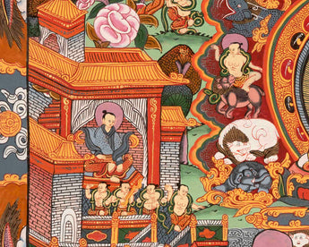 The central figure in the thangka is Shakyamuni Buddha. The thangka portrays the birth of Prince Siddhartha in the kingdom of Kapilavastu, symbolizing the Buddha's human incarnation. It then progresses through pivotal moments such as his renunciation of worldly life, his intensive meditation under the Bodhi tree, and his enlightenment, where he attains the state of Buddhahood and finally Buddha's passing which is popularly known as Mahaparinirvana.