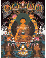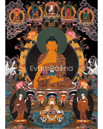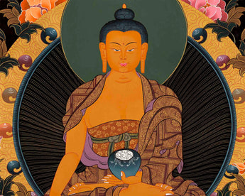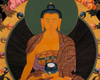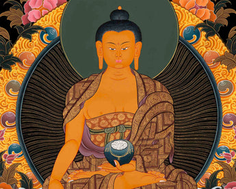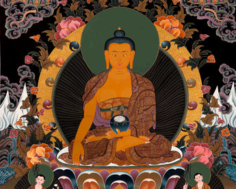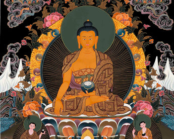 Immerse your spiritual space in the profound teachings of our Shakyamuni Buddha Thangka, adorned with the representation of Five Buddhas at the top. Shakyamuni Buddha, the historical Buddha, is elegantly depicted in a meditative pose, radiating universal compassion and wisdom. The addition of the Five Buddhas enhances the Thangka's spiritual depth, symbolizing various facets of enlightenment. This delicately handpainted thangka serves as a visual gateway to the teachings of compassion, wisdom, and interconnectedness embodied by Shakyamuni Buddha and the accompanying Buddhas.