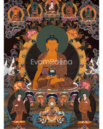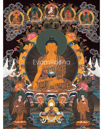 Original Shakyamuni Buddha Thangka with Five Buddhas at the Top | Perfect For Your Meditation Altar |