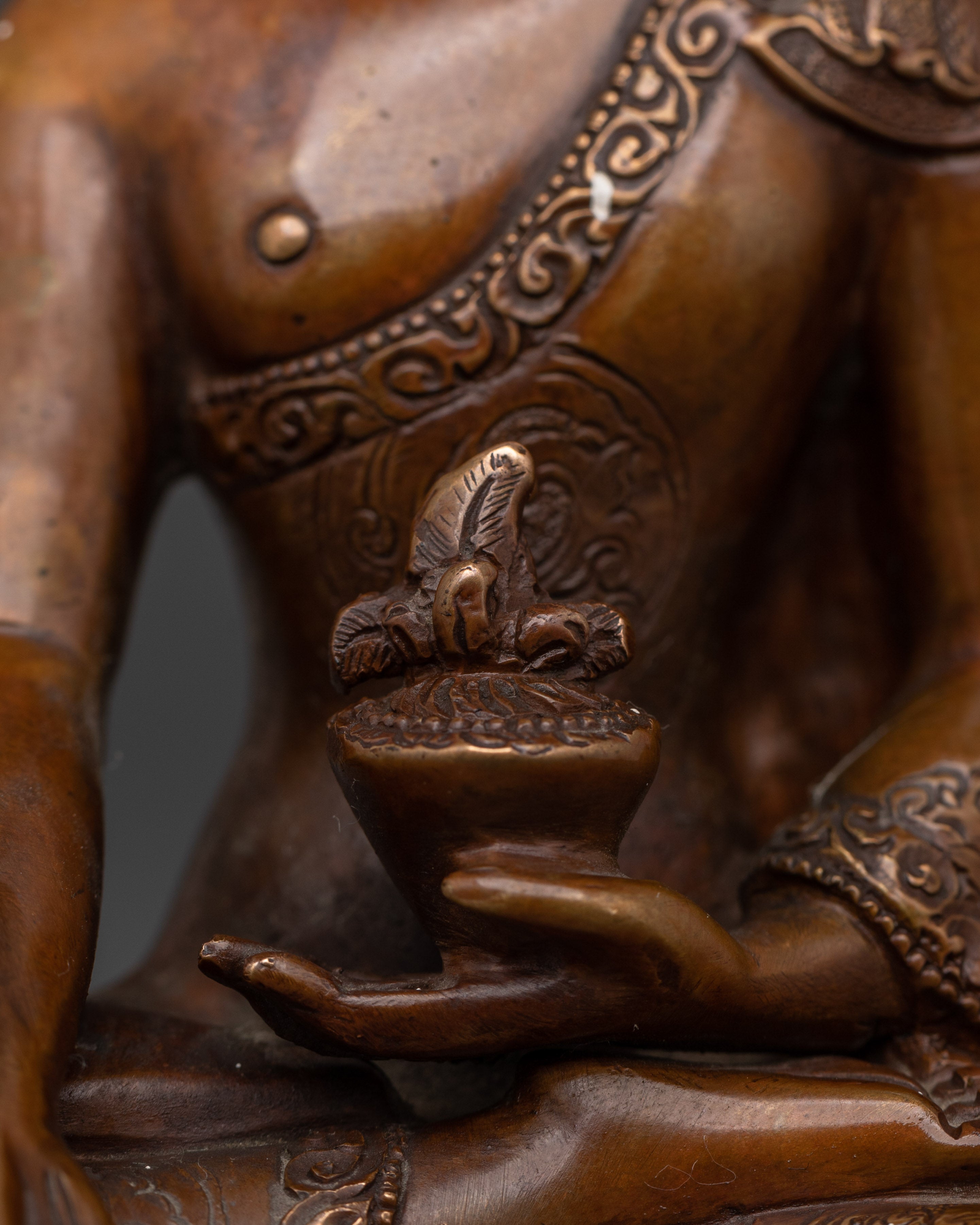 The Medicine Buddha is also known as the Buddha of Healing, and is referred to as Bhaishajyaguru in Sanskrit. His teachings emphasize the desire to accumulate wealth and pleasure in this life while also striving to alleviate suffering in sentient beings. Many Mahayana meditators admire his healing prowess. He is typically depicted with a begging bowl and medicinal herbs, and is often shown with a blue (lapis lazuli) body.