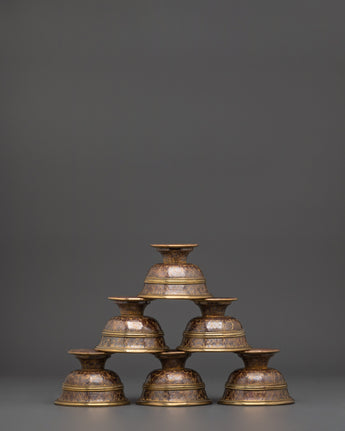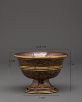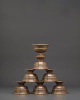 Oxidized Copper Offering Bowl Set designed for Buddhist rituals, shrine decoration, and daily puja practice. These bowls, with a diameter of 10.5 cm and a height of 7 cm, are enough to accommodate significant offerings. The exquisite oxidized finish imparts an aged, sacred aura, enhancing its visual and ritual significance.