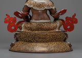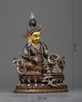 Explore the incredible artistry of the Oxidized Dzambhala Figurine, which has a base diameter of 10.6 inches and a majestic height of 12.2 inches. This sculpture, which is made of oxidized copper and lavishly plated in silver, radiates wealth and prosperity. The deftly placed acrylic and gold paintings by expert artisans accentuate the figurine's heavenly presence, and the accurate detailing symbolizes Dzambhala's guardian function in dispensing wealth and fortune.