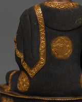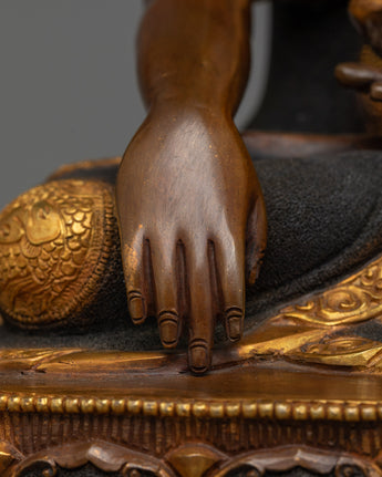 More than just a pretty object, this statue of Shakyamuni Buddha represents spiritual development and inner serenity. Its oxidized surface draws attention to it, and its vivid acrylic paintings and gold-gilded embellishments accentuate its presence, bringing serenity and knowledge into your home or shrine. This artwork truly represents Buddhist traditions because of the eight auspicious motifs on the robes, which provide deeper spiritual value.