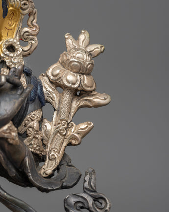 The Oxidized Green Tara Figurine, which has a base diameter of 6.3 inches and an elegant height of 8.3 inches, is a stunning example of minute detail. This sculpture, which is made of oxidized copper with a silver plating and delicately painted in gold and acrylic, exudes a timeless beauty and spiritual insight. The figurine's fine details, such as its calm countenance and billowing attire, convey Green Tara's understanding and wisdom.