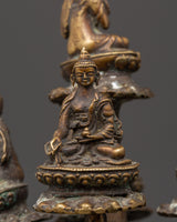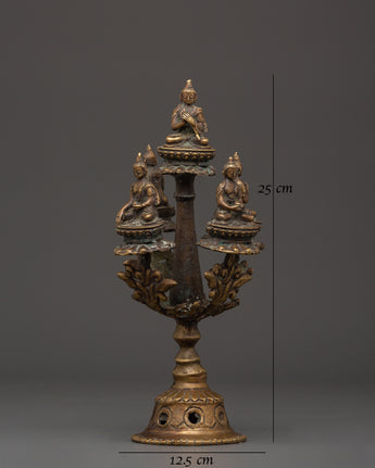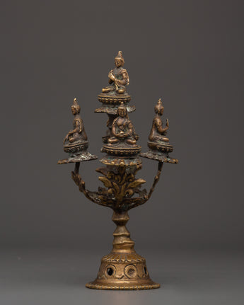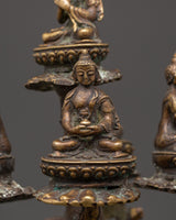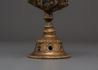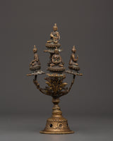 This Tibetan spiritual adornment is crucial for ceremonial practices, particularly meditation and offering ceremonies. The beautiful bronze art adds to its aesthetic appeal and has spiritual meaning, representing the essence of compassion, knowledge, and protection. The wonderfully sculpted Buddha figurines are displayed in a harmonious pattern, representing unity and balance. This Pancha Buddha Ritual Object is ideal for use in temples, personal shrines, or as a focal point in your spiritual environment. It highlights Tibetan Buddhism's rich tradition. Whether used in ceremony or as a sacred décor element, it reflects the eternal wisdom of the Five Dhyani Buddhas.