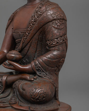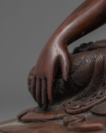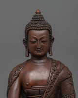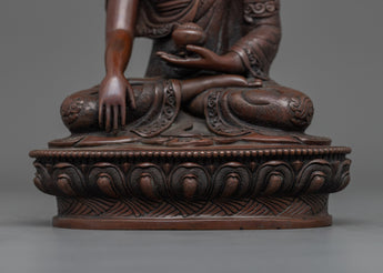 The Peaceful Buddha Shakyamuni statue is a serene and meditative depiction of the historical Buddha, evoking calm, wisdom, and inner peace. Standing at 9.4 inches tall, this skillfully handcrafted statue is made of oxidized copper, that complements any religious area or home decor.
