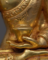 The Peaceful Figurine of Shakyamuni Buddha is a beautifully crafted piece with a height of 5.7 inches (14.5 cm) and a base width of 4.1 inches (10.5 cm). Made from a copper body, it is adorned with 24K gold gilding, complemented by gold and acrylic paintings that highlight its intricate details. This statue, created by skilled Nepalese artisans, radiates spiritual importance, making it an ideal for altars, meditation rooms, and religious home decor.