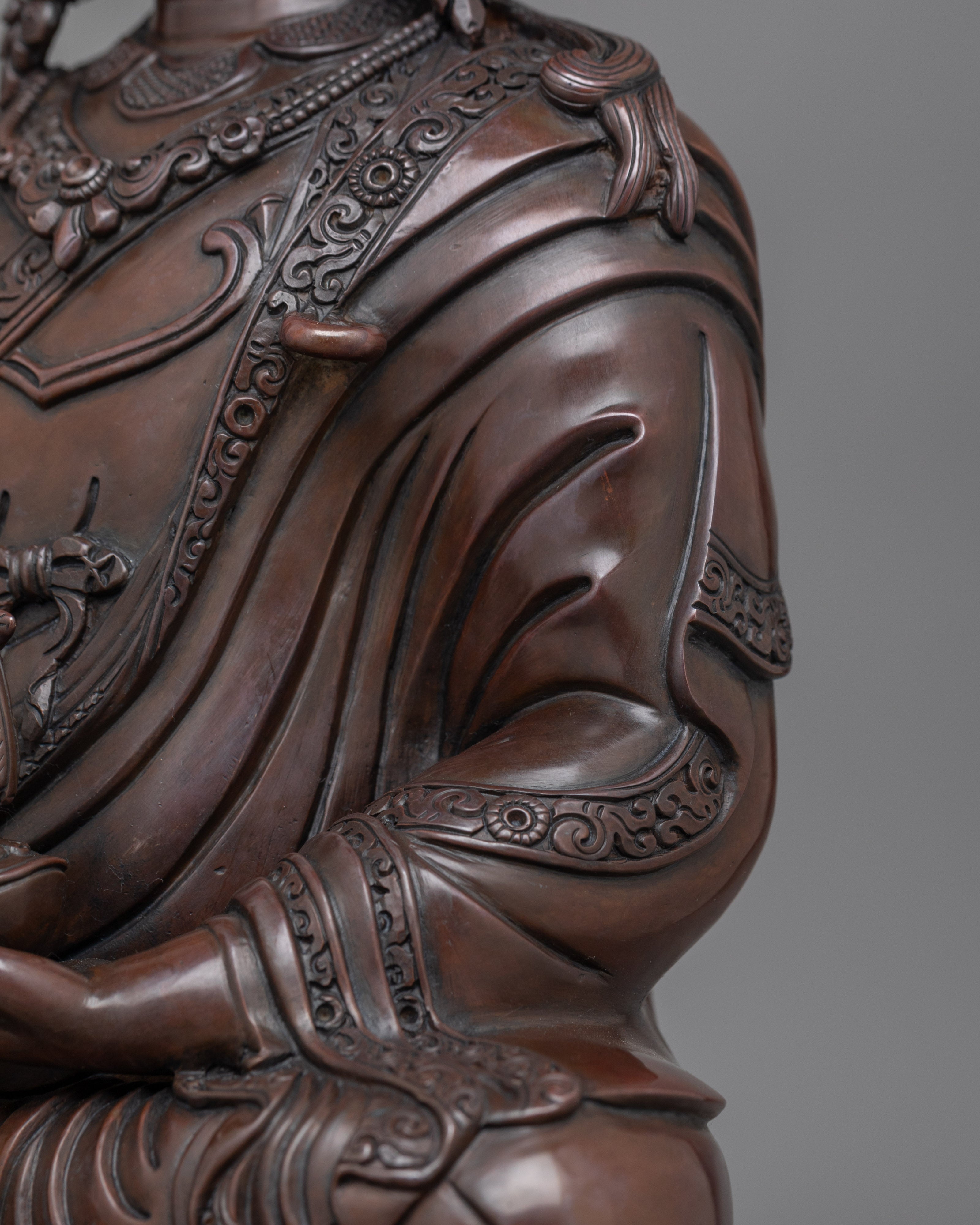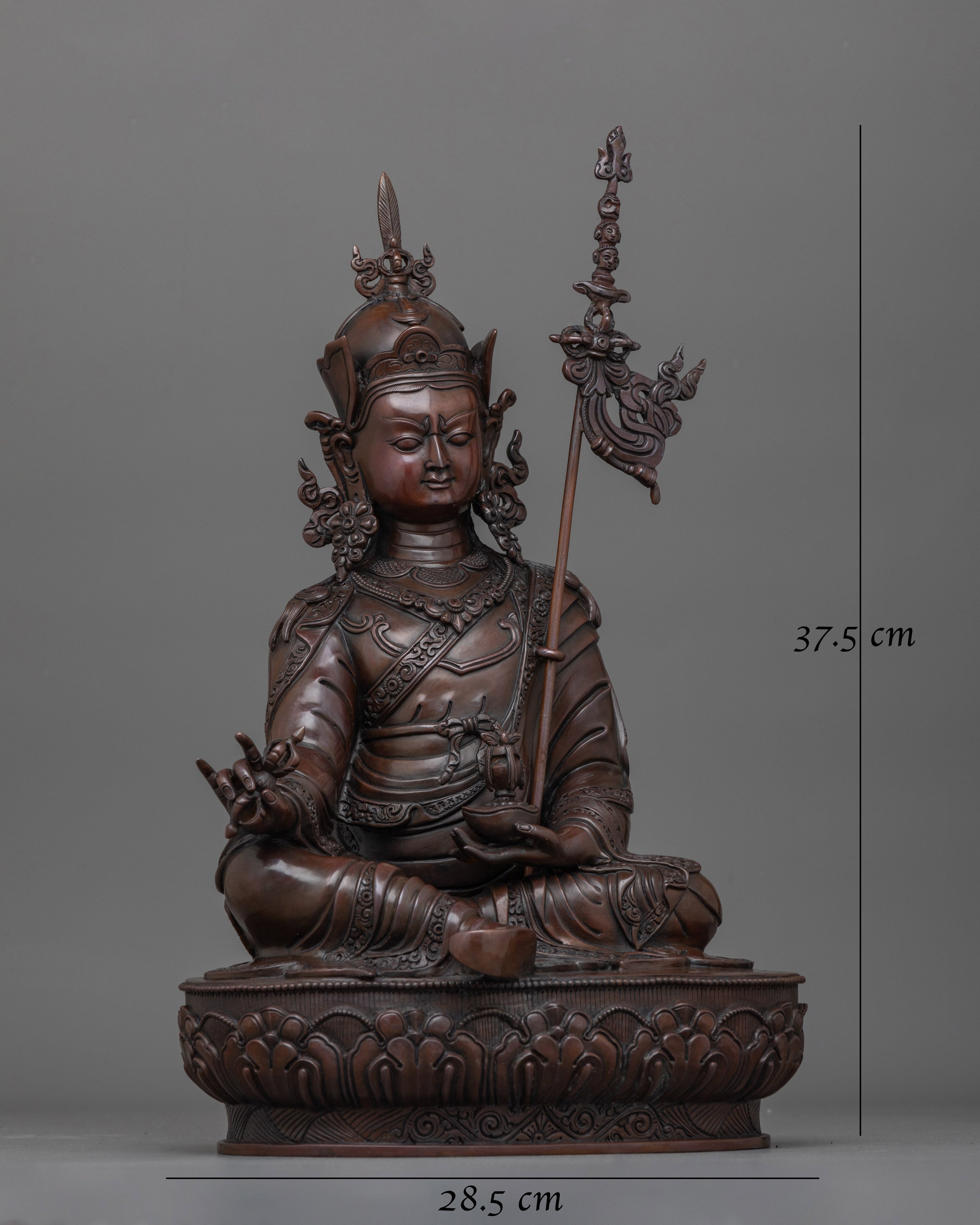 Pema Guru Rinpoche monument reflects the spirit of Guru Rinpoche's enlightened presence, with each detail carefully created to portray his calm and strong personality. The statue's 11.2-inch base assures stability while also adding to the piece's overall majesty. The oxidized finish gives the statue an aged appearance, representing Guru Rinpoche's timeless knowledge and teachings, inspiring practitioners worldwide.