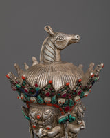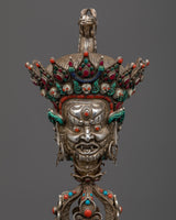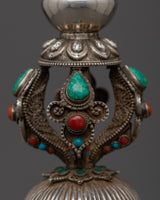 With our mesmerizing Phurba Mantra Practice Dagger, you can unleash the power of ancient rituals! This majestic phurba is a true masterpiece, meticulously handcrafted on a lustrous silver, and embellished with Coral, Irani, and Lapiz Lazuli Stones. It commands respect and attention as it stands tall at 51 cm. With the included stand, it becomes a spiritual energy focal point in your sacred space. Take advantage of its symbolic power and embark on a transformative journey of enlightenment. Accept the divine energy that flows through the Phurba Mantra Practice Dagger and expand the scope of your spiritual practice.