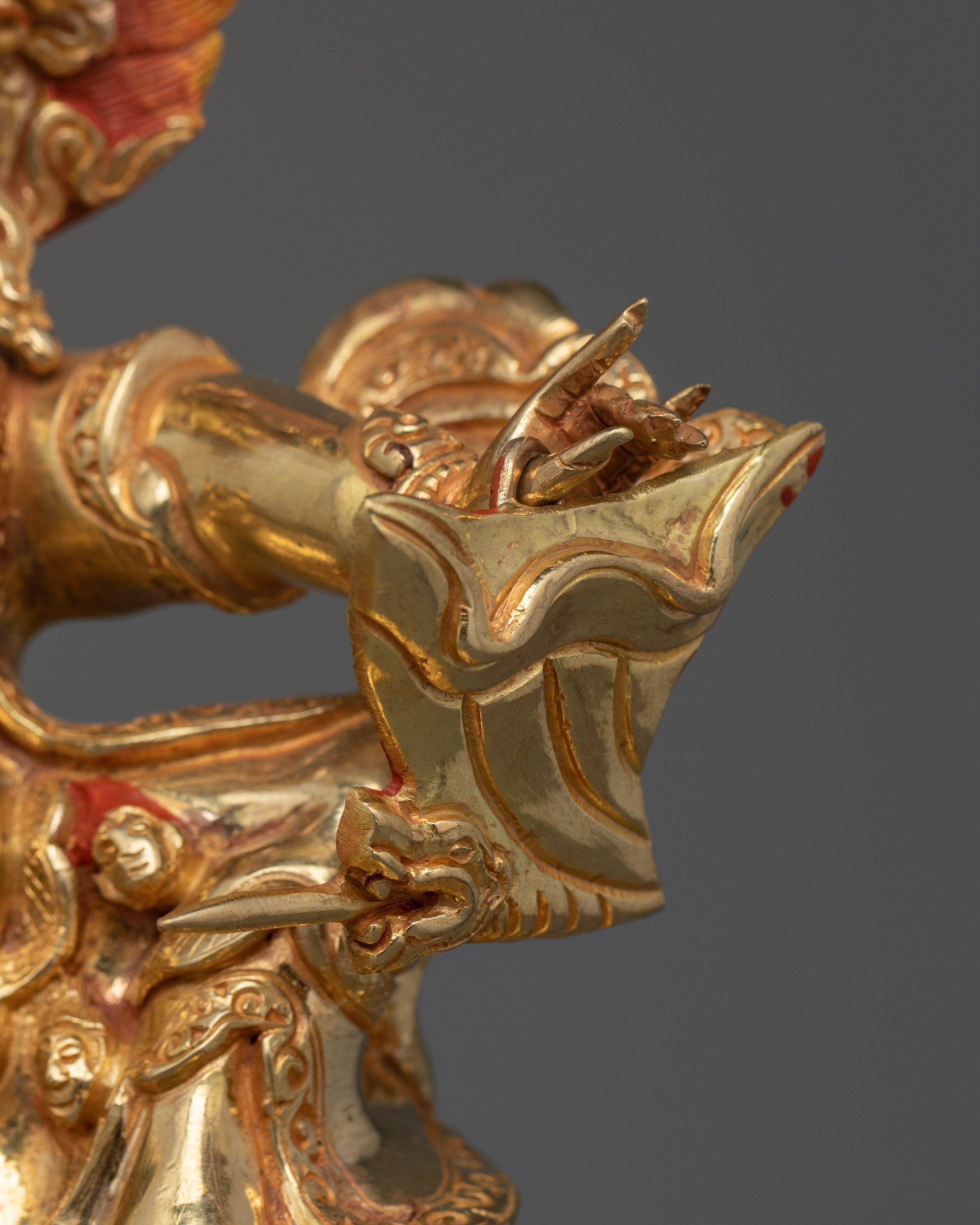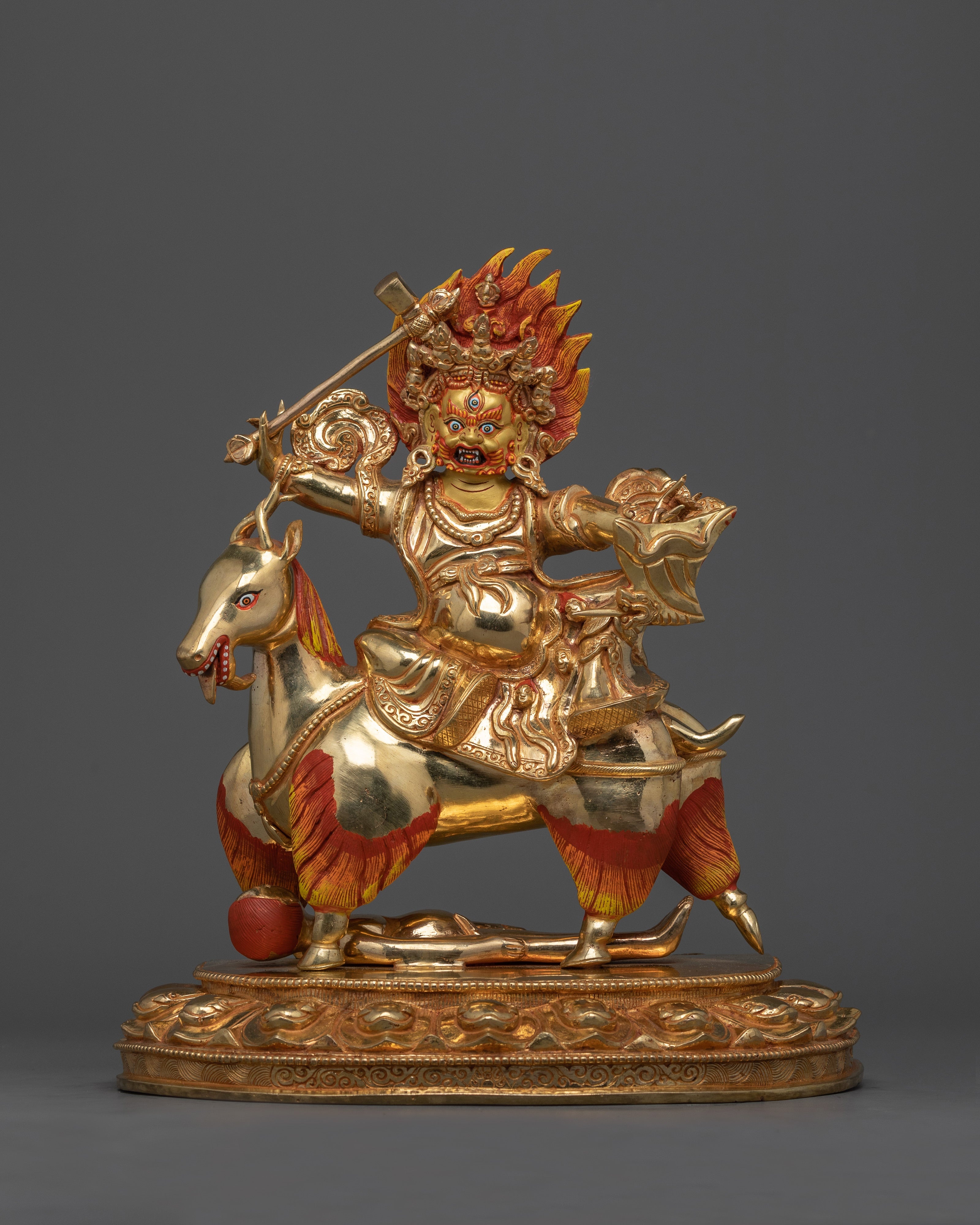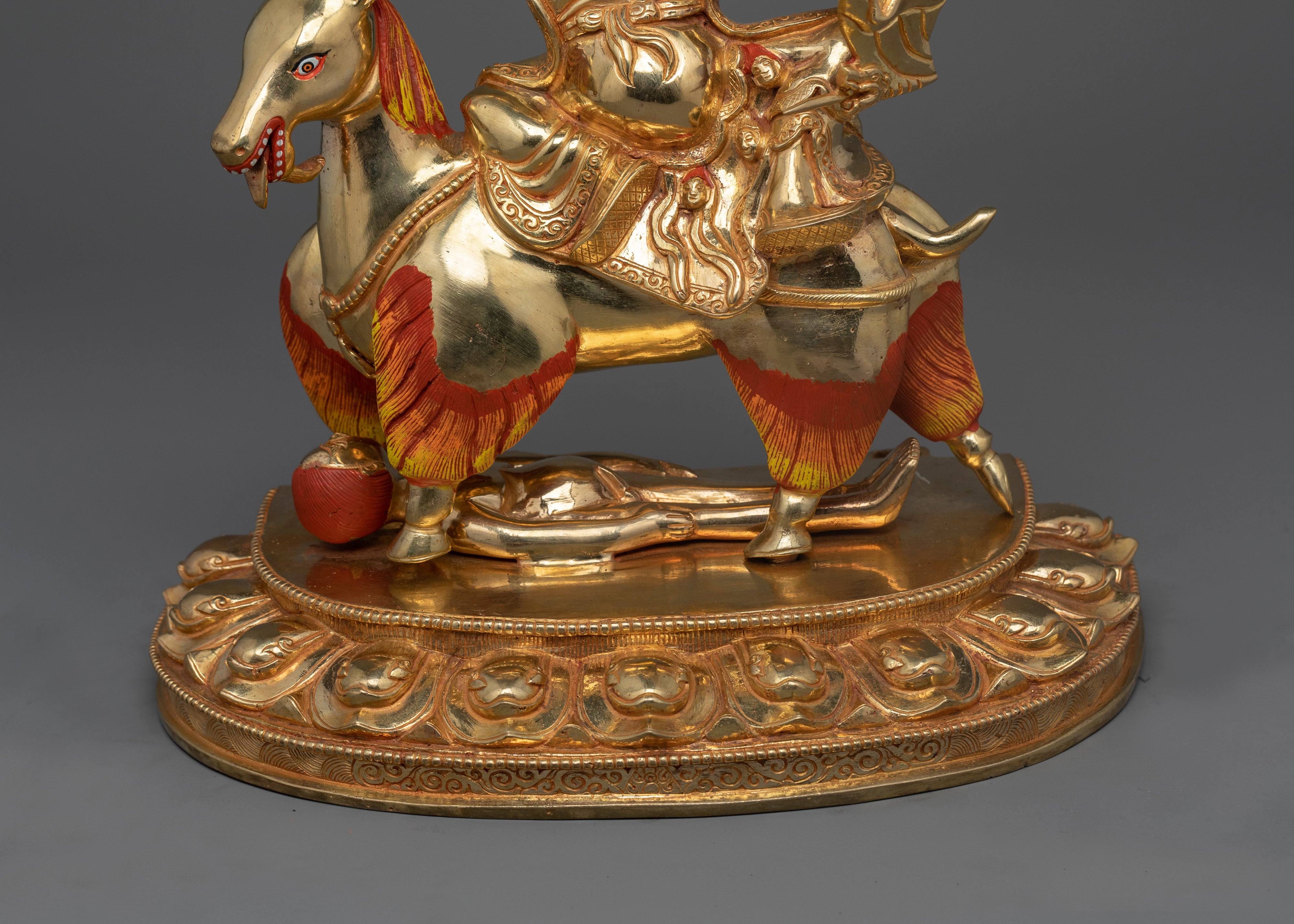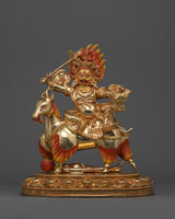 The statue of Garwa Nagpo Damchen, a strong powerful protector god, is 13.4 inches tall with a 9.8-inch base and weighs 4.57 kg. This statue, made of 24K gold-gilded copper and featuring gold and acrylic paints, depicts Damchen's powerful and menacing appearance. Damchen, known for his dark color and stern appearance, is depicted riding a horse as a metaphor of his ability to move and overcome obstacles. The horse balso reflects his tenacity in defending Buddhist teachings against obstacles and negative influences.