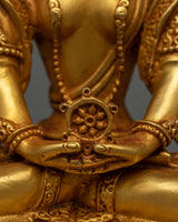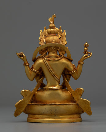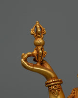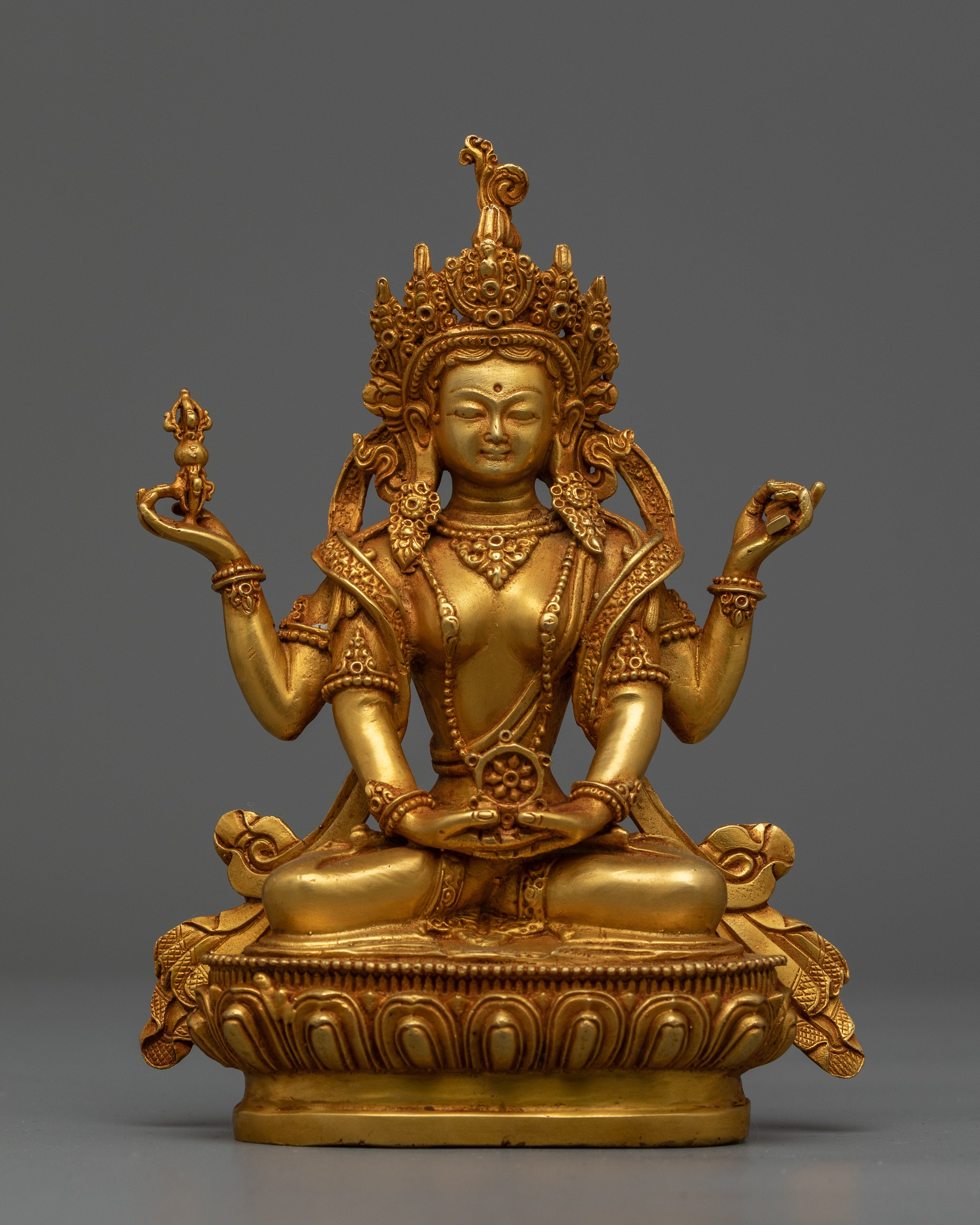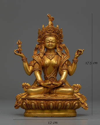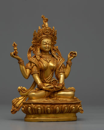 The Prajna Paramita Statue testifies to the wisdom and transcendental knowledge contained in the teachings of Prajna Paramita, the Mother of all Buddhas. This machine-made statue, painstakingly crafted with precise attention to detail, is adorned with a radiant electro-gold plating that gives it an air of divine illumination. Standing 17.5 cm tall, it exudes a presence that begs respect and reflection, enticing followers to reflect on Prajna Paramita's profound teachings more deeply.