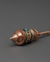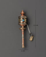 This small copper prayer wheel is wonderfully crafted, a spiritual buddhist altar tool. It is just 7.5cm in height and 2cm in breadth, weighing 0.008kg, and is designed for portability and ease of use. Its copper and brass body, embellished with a turquoise stone inlay, possesses both spiritual significance and ornamental beauty, making it an excellent choice for personal spiritual rituals or as a thoughtful gift.
