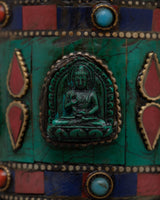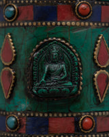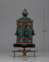 This Prayer Wheel with Copper Body and Protective Stone Accents is carefully constructed with a copper body, a brass base, and replication turquoise and coral inlays, making it both physically appealing and spiritually significant. It represents compassion, enlightenment, and the cyclical nature of existence by using sacred phrases such as Om Mani Padme Hum and elaborate motifs such as the Wheel of Dharma and Lotus Flower. The metal foundation ensures strength, and the turquoise and coral represent protection, energy, and spiritual wisdom.