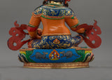This Traditional Prosperity Deity Dzambhala Statue is carefully made from genuine copper and gilded with 24K gold gilding for a brilliant, celestial presence. The statue's artwork is detailed with elaborate gold and acrylic paintings, adding depth and vibrancy to its appearance. This piece, measuring 13.2 inches (33.5 cm) tall with a hefty base of 15.4 inches (39 cm) and weighing 9.52 kg, is both visually spectacular and massive, making it a long-lasting and noticeable addition to any spiritual area.